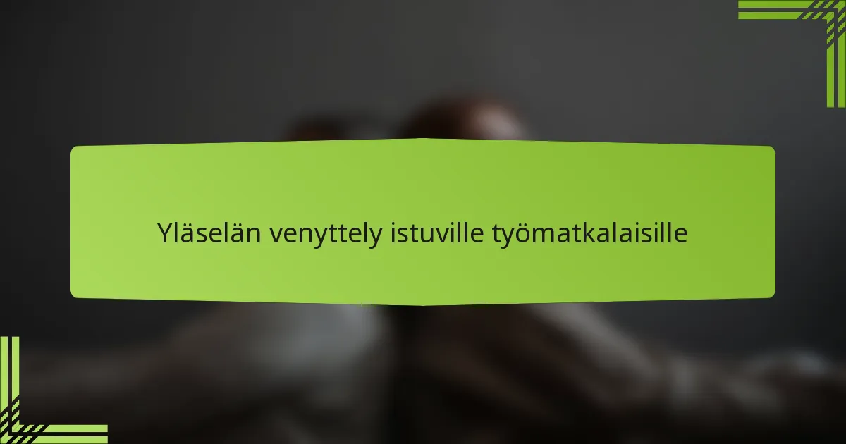 Tehokkaat yläselän venytykset työmatkalaisille voivat lievittää jännitystä ja parantaa ryhtiä, erityisesti pitkien istumisaikojen jälkeen. Sekoitus staattisia ja dynaamisia venytyksiä sekä jooga-asentoja voi tarjota merkittävää helpotusta ja parantaa yleistä hyvinvointia.